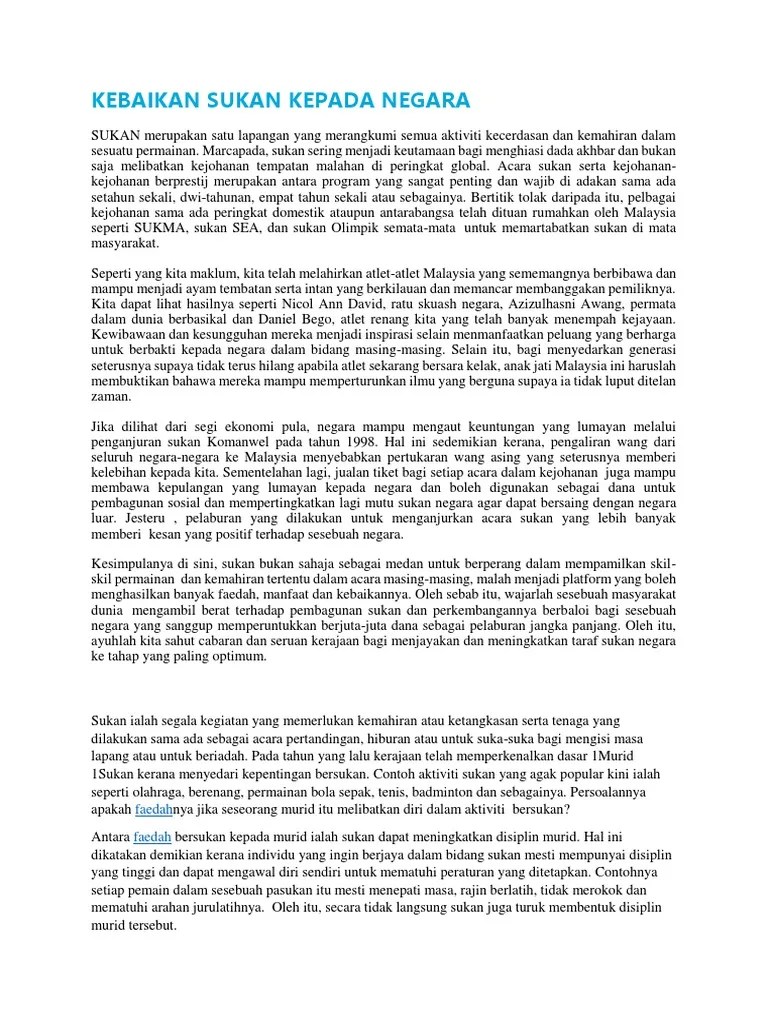 Hal ini demikian kerana, aktiviti sukan mendatangkan faedah yang banyak kepada masyarakat dan negara kita. Bertegur sapa dengan orang di . Bidang sukan merupakan salah satu bidang yang penting di negara kita. Persoalannya apakah faedah jika seseorang murid itu melibatkan diri dalam aktiviti bersukan? Menghidarkan diri daripada terjebak dalam gejala sosial.